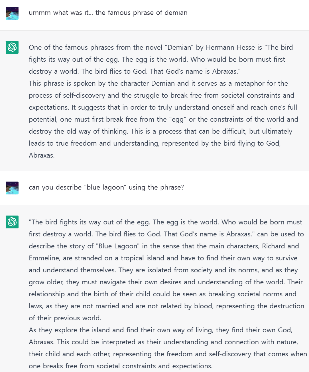 새는 알에서 나오기 위해 투쟁한다. 알은 새의 세계이다. 누구든지 태어나려고 하는 자는 하나의 세계를 파괴하여야 한다. 새는 신을 향해 날아간다. 그 신의 이름은 아브락사스이다.