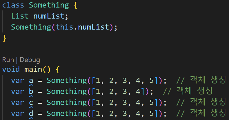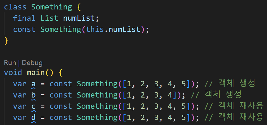 하지만 const 생성자를 사용하게 되면 동일한 객체를 여러번 생성하지 않고 메모리에 올라가있는 객체를 100번 재사용하게 된다.