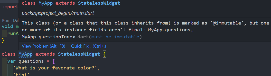 이러한 철학 때문에 StatelessWidget의 변수를 final 이나 const 로 지정하지 않으면 기분 나쁜 줄이 생긴다.