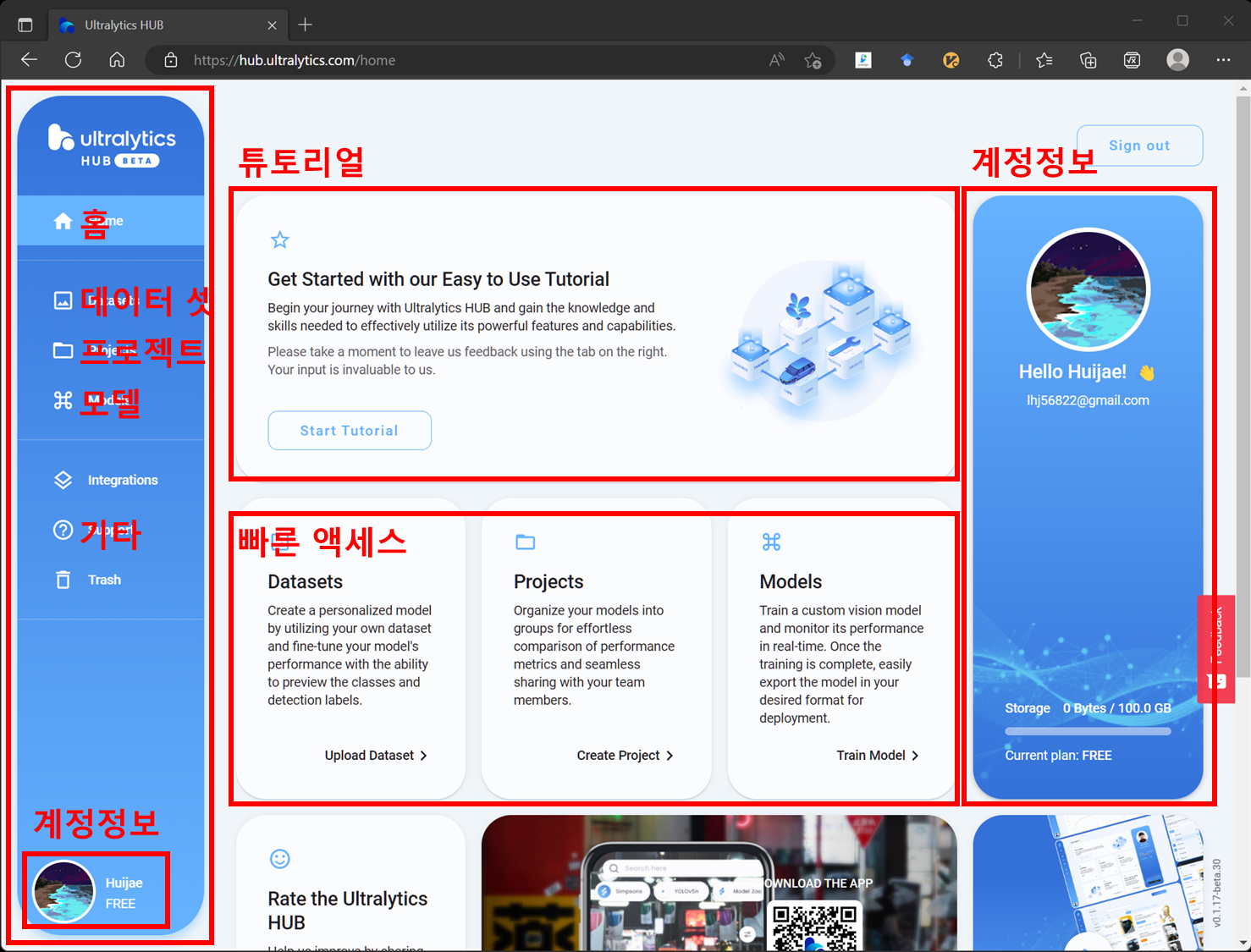 오른쪽에는 튜토리얼과 빠른 액세스, 계정 정보가 보여진다.
