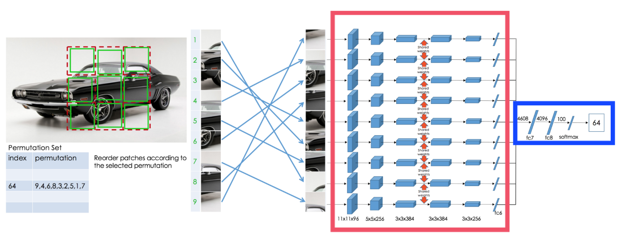 근데 모든 경우의 수를 학습하기 보다는 미리 정해놓은 몇개의 permutation을 저장해 놓고 모델이 입력으로 들어온 tile들의 순서가 몇 번째 index의 permutation과 일치하는지를 맞추도록 학습했다.