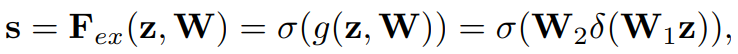 여기서는 Squeeze를 통해 얻은 채널별 값들의 의존성을 얻어내려고 합니다.