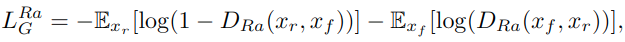 기존 Standard Gan과의 차이점은 Generator를 학습할 때는 보통 real data 항은 Generator에 영향을 주지 않기 때문에 무시되지만 Relativistic Gan에서는 real data가 Generator 업데이트시 영향을 준다는 것입니다.
