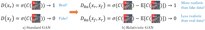 하지만 Relativistic GAN의 Discriminator는 a가 b보다 진짜 같은지를 판단합니다.