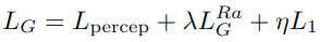최종 loss 식에는 perceptual loss, RaGan loss, L1 loss가 사용되었습니다.