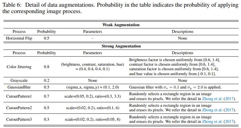 표를 보면 weak aug로는 horizontal flip만 사용하였고 strong aug로는 주로 색을 변화시키거나 픽셀을 랜덤하게 지우거나 블러를 하는 방법을 사용했습니다.